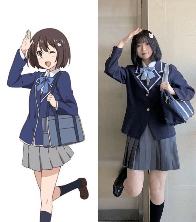 樱花千代是动画作品《月刊少女野崎君》的女主角。我们都知道这是一部非常有趣的校园动画作品。许多动画角色也穿着JK制服。樱花千代的JK风格也是满满的文艺范。他的外衣是一件灰色西装外套,内里搭配一条深蓝色领结。再加上一条深蓝色的裙子,整体造型让人感觉文艺范十足。